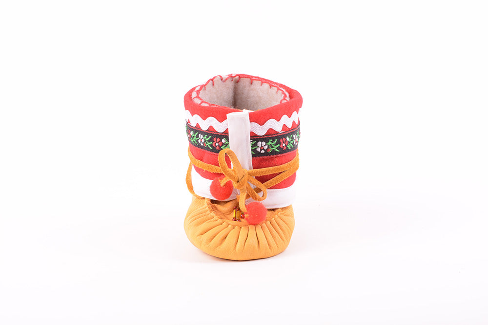 Give your children comfort and warmth with these beautifully handcrafted moccasins. Made from leather of cow tanned in white, they combine elegance with a natural softness. The seal fur adds a unique touch, complemented by the sheep wool lining to keep little feet perfectly warm. The caribou wood button provides an authentic finish, reflecting the beauty of our Indigenous heritage.
