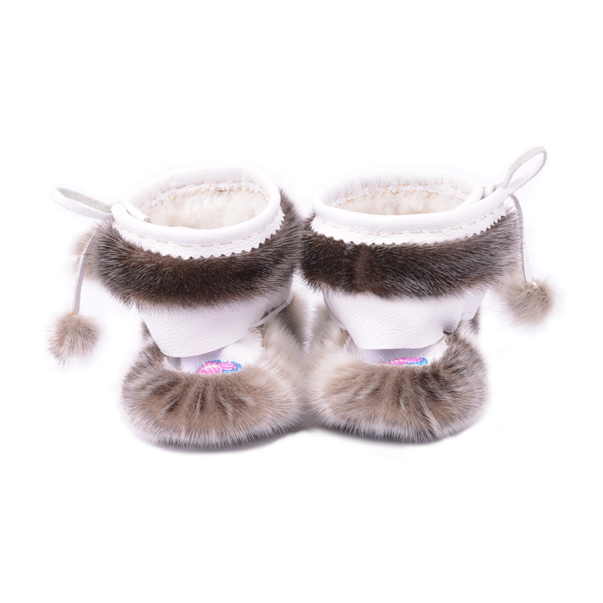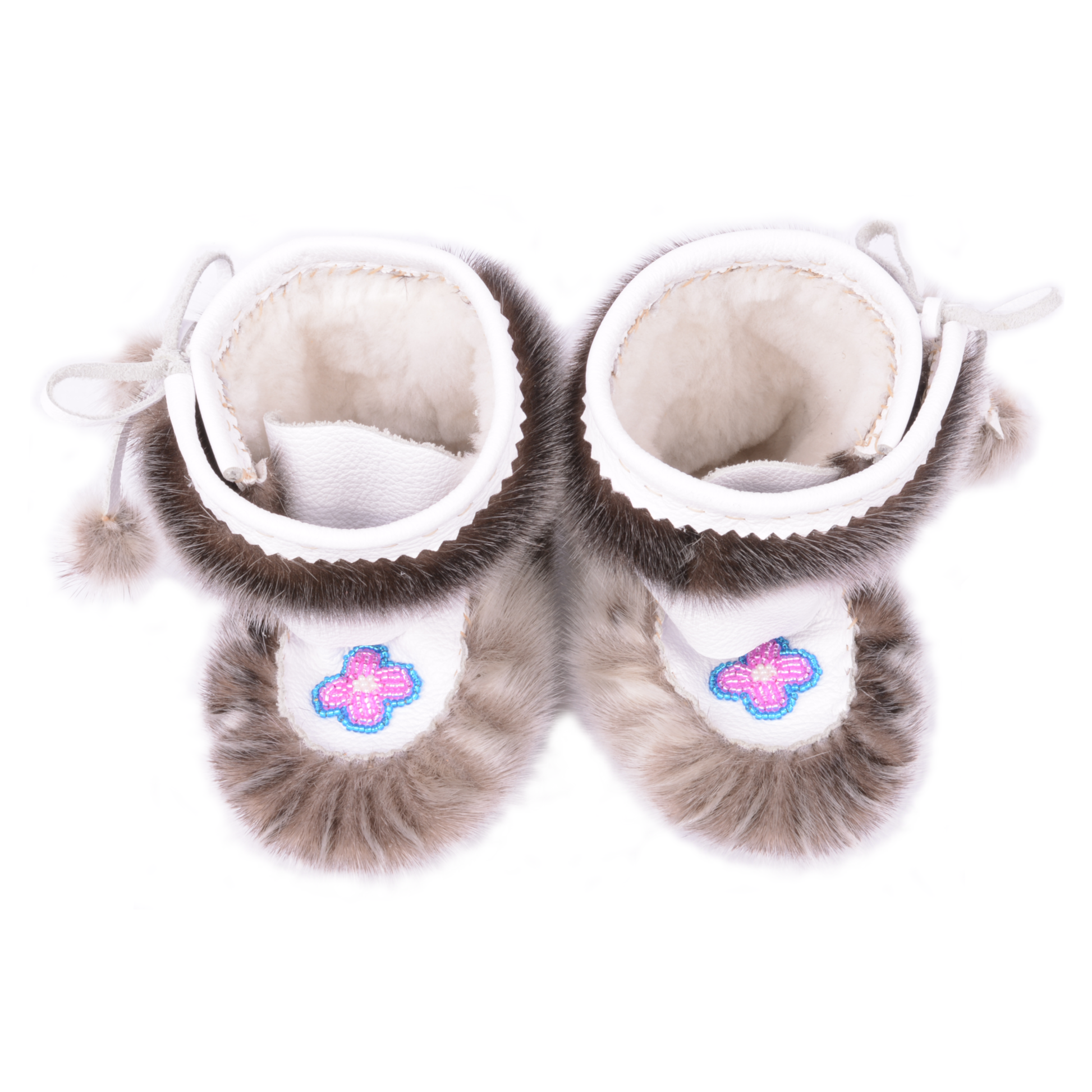 Offrez à vos enfants le confort et la chaleur avec ces magnifiques mocassins faits à la main. Confectionnés en cuir de vache teinté en blanc, ils allient élégance et douceur naturelle. La fourrure de loup marin apporte une touche unique, tout comme la doublure en mouton, pour garder les petits pieds bien au chaud. Le bouton en bois de caribou ajoute une finition authentique, reflétant la beauté de notre héritage autochtone.