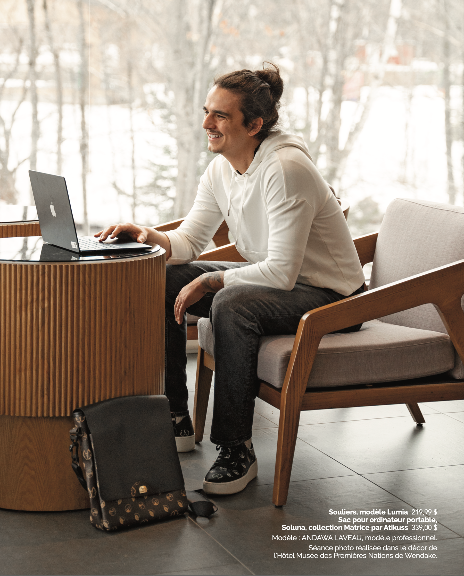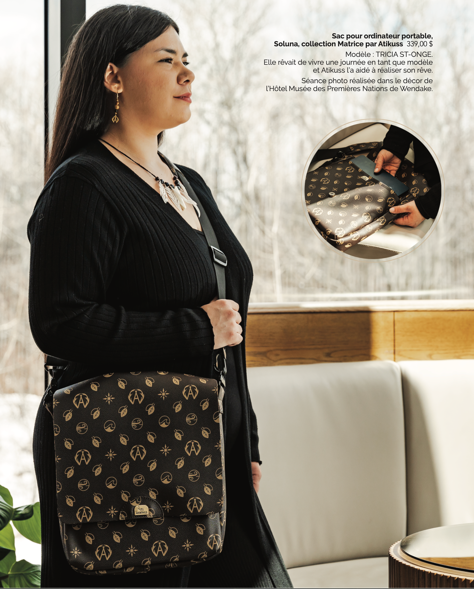 Le sac Soluna, fabriqué à la main au Québec, allie élégance, durabilité et authenticité. Conçu pour accueillir vos appareils électroniques avec style, il vous accompagne au quotidien. Une pièce unique, en édition limitée, pour célébrer la culture autochtone avec finesse.